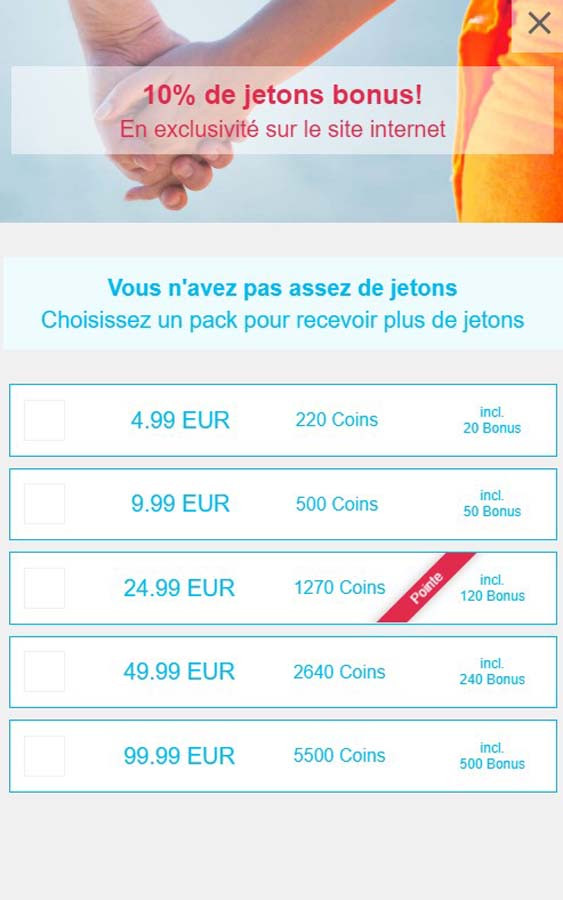 iDates l’a parfaitement compris et vous offre la possibilité de payer simplement en fonction de votre utilisation. Par ailleurs, cela vous permet d’utiliser le site quand bon vous semble puisqu’une fois achetés, vos jetons ont une durée d’utilisation illimitée.